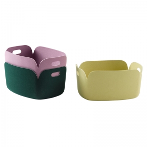 It’s a great little basket for storing magazines or any other bits and pieces. Polymer felt combined with a soft form give the basket a friendly appearance. The name Restore is inspired by the fact that the baskets are made of recycled PET bottles.