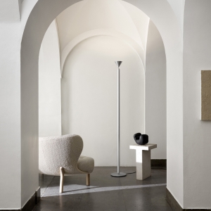 With a composition that alludes to mass and weight, Apollo is a lamp made from a solid piece of machine-turned brass or aluminium. Its conical shapes balance end-on-end like spinning gyros, emphasising a dynamic, downward, thrusting force. A lamp with a real heightened material presence, with its surfaces left deliberately raw. The Apollo family comes in a range of colours that can be used singularly or hanging in various heights as a group constellation. A new addition to the family is the distinctive Apollo 180 floor lamp, in lacquered or black anodised aluminium. The upward turning conical shapes give an indirect light.