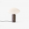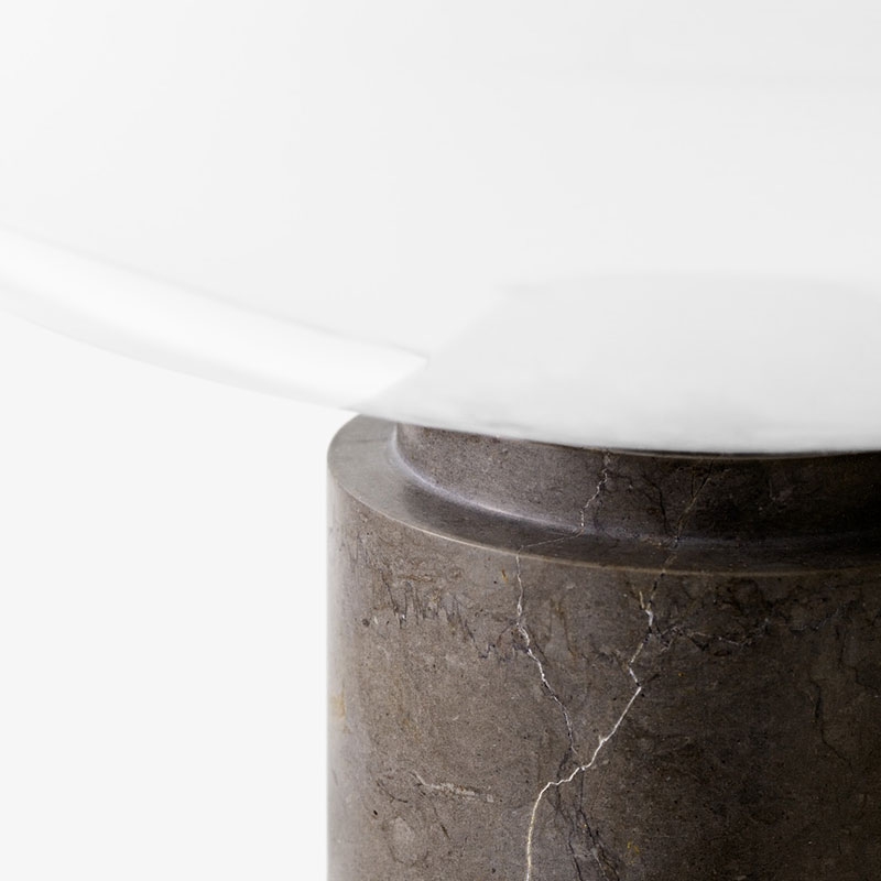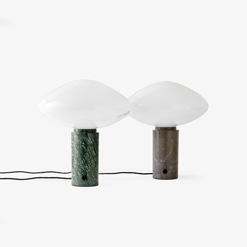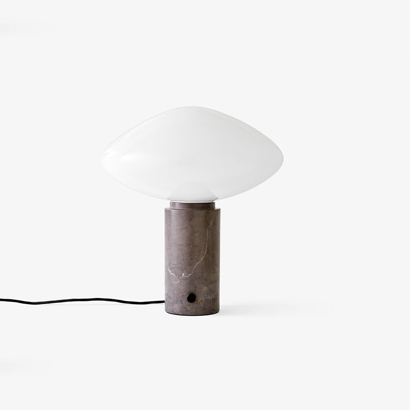 The Mist table lamp, made from mouth-blown opal glass, features a thick marble pillar with a small dimmer switch. The contrast between the light shape of the glass and the solidity of the marble creates an elegant design rich in materiality.