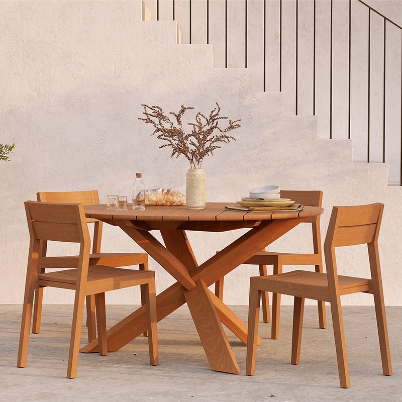 A popular interior favorite, the EX 1 dining chair in solid teak is a timeless design, to add effortless stability to your outdoor seating needs.