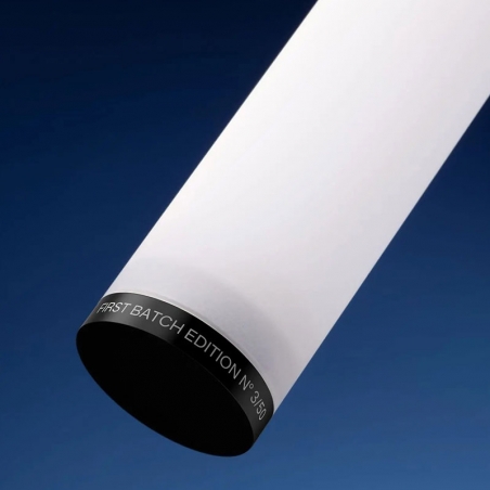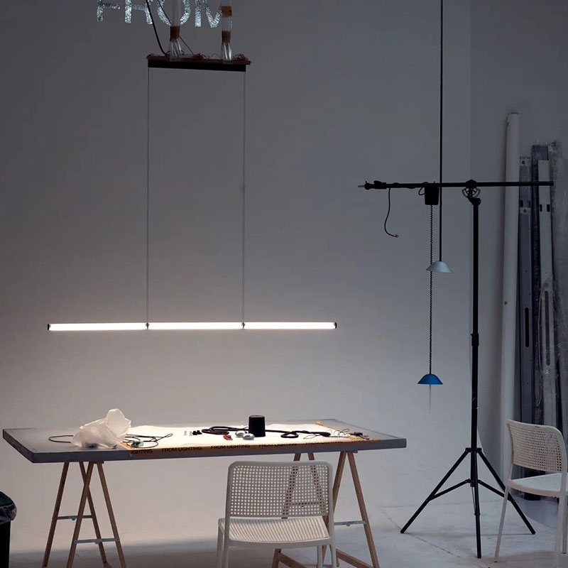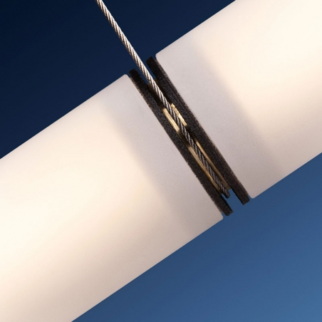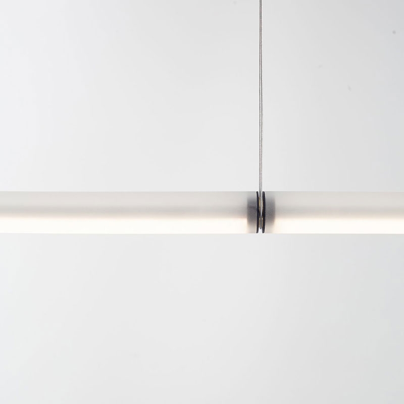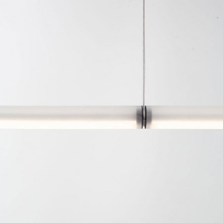 Satellit is an elegant linear suspension lamp. It consists of a glass tube hanging on two thin steel cables that provide electrical power. The glass tube can be freely rotated, allowing you to adjust the lighting atmosphere in a room according to your needs. By rotating the lamp downward, you can provide direct light over a table for work. Conversely, by rotating it upward or to the side, you can create a more intimate ambiance with indirect light.