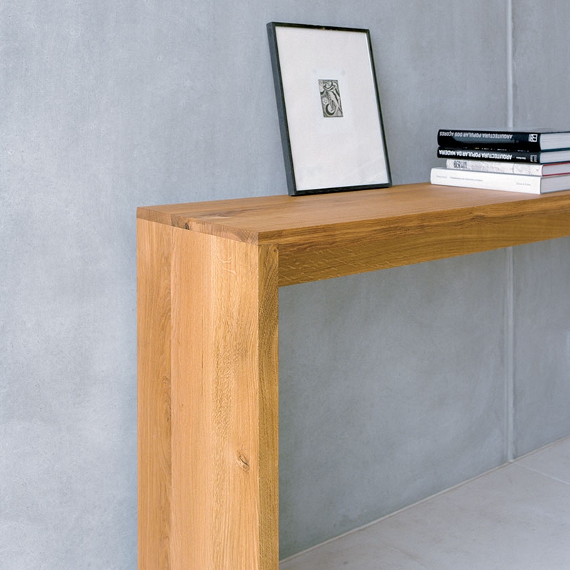 Il design pulito e la materialità pura rendono la consolle ALTO particolarmente versatile. I giunti angolari sono un dettaglio distintivo del design e15, nel quale il piano spesso 40 mm è fresato fino a metà del suo spessore alle estremità, dove poi si inseriscono i laterali.