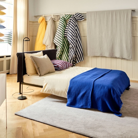 Tamoto è influenzato dalla qualità del drappeggio delle maniche a kimono, che ha ispirato l'uso innovativo di Shane del tessuto pieghevole sulla struttura del letto. La testiera morbida e drappeggiata è controbilanciata dalla struttura in tubolare d'acciaio dalle dimensioni generose, creando un ibrido letto-divano contemporaneo e confortevole che non è inteso esclusivamente per dormire, ma anche come base per leggere, lavorare o guardare la TV e altre attività. Con un design piatto e facile da montare, rivestimento della testiera rimovibile e materiali riciclabili, la funzionalità è stata presa in considerazione in ogni fase del processo di progettazione. Disponibile in una varietà di dimensioni e tessuti morbidi selezionati, Tamoto è un letto versatile che si adatta alla maggior parte delle camere da letto di dimensioni e agli stili di design. HAY consiglia di utilizzare le doghe standard e i materassi standard con il letto Tamoto per una soluzione completa ottimale.