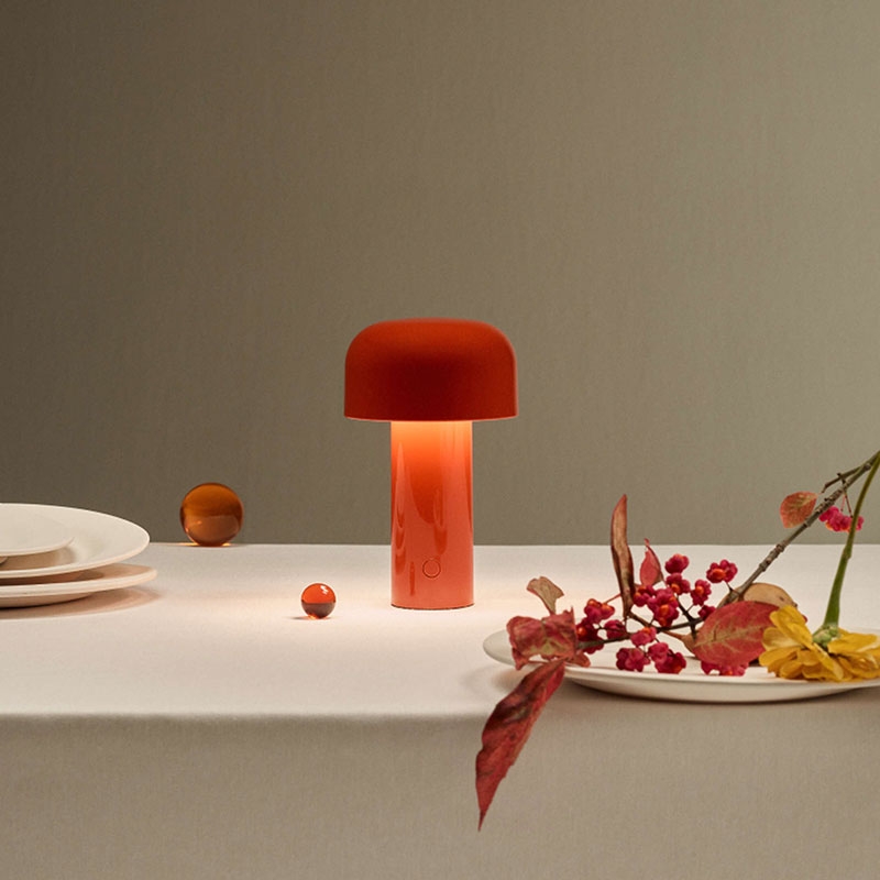 Apparecchio di illuminazione da tavolo ricaricabile a luce diretta. Base e cupola in PC colorato. Diffusore in PC opalino fotoinciso stampato ad iniezione. Autonomia fino a max 24h e ricarica tramite Micro-USB-C. Interruttore a pulsante posizionato sulla base che garantisce la funzione dimmer 4step. Indicatore stato batteria posizionato sotto la base. Cavo ricarica USB-C incluso nell'imballo, lunghezza utile 120cm.