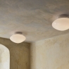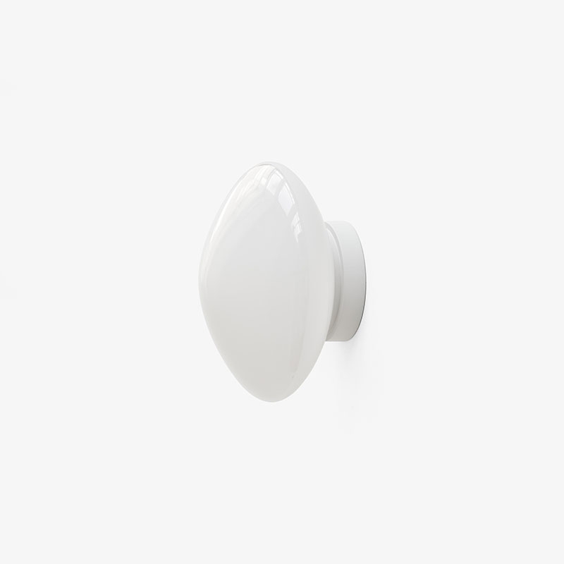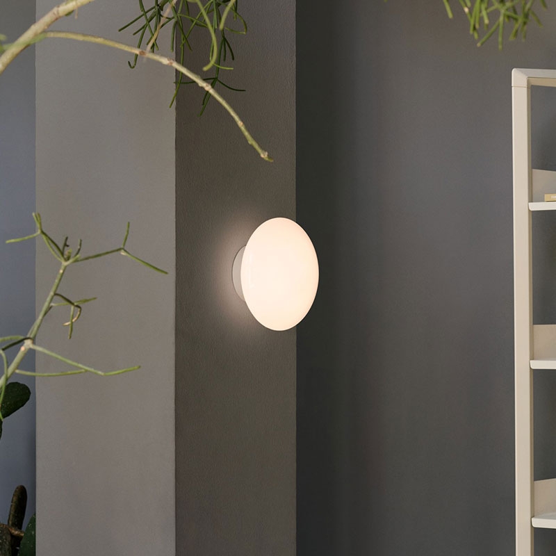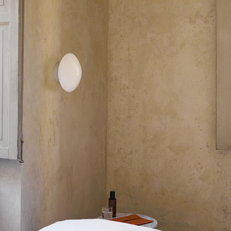 Mist, realizzata in vetro opalino soffiato, è sorretta da una base di marmo con un piccolo interruttore. Il contrasto tra la leggerezza del vetro e la solidità del marmo dà vita a un design elegante e materico.