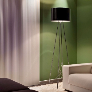 Apparecchio di illuminazione da terra, da interno, a luce diffusa. La struttura di supporto dell’apparecchio è in tubolare di acciaio cromato. Supporto diffusore in lega di Zama pressofusa lucidata e cromata. Copertura portalampada in PA6 (Nylon) stampato di colore bianco ad iniezione.