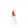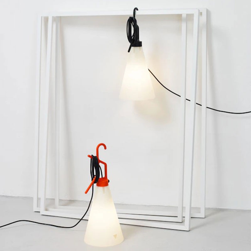 Apparecchio di illuminazione multiuso. Gancio/maniglia, avente anche la funzione di avvolgicavo, e diffusore conico opalino stampati ad iniezione in polipropilene sostenibile ricavato da scarti del processo industriale. Interruttore a pulsante situato sulla maniglia. Poiché nel processo di assemblaggio non viene utilizzata alcuna colla, Mayday è facile da smontare in modo che ogni parte possa essere riciclata correttamente.