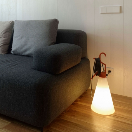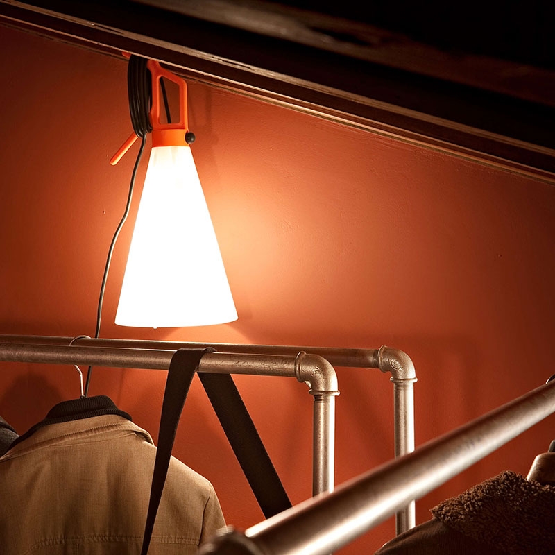 Apparecchio di illuminazione multiuso. Gancio/maniglia, avente anche la funzione di avvolgicavo, e diffusore conico opalino stampati ad iniezione... più dettagli