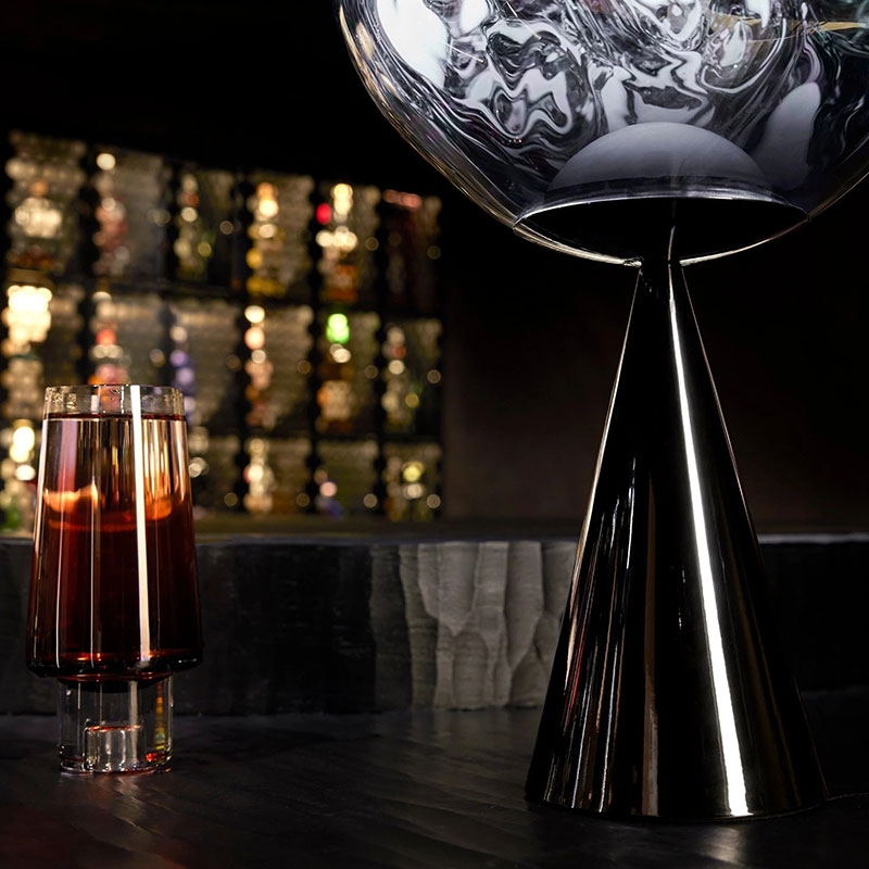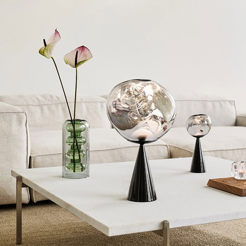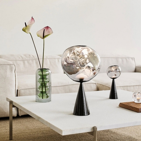 Melt Fat Table è una lampada realizzata con la tecnica della soffiatura in stampo e della metallizzazione sottovuoto, che crea una sfera fusa dalla luminosità unica. Dotata di un modulo LED integrato, la sfera poggia su una base tubolare e produce un effetto vetro soffiato a caldo quando è accesa e una finitura a specchio quando è spenta. Prodotto in Germania, ricorda il vetro fuso o un ghiacciaio che si scioglie.