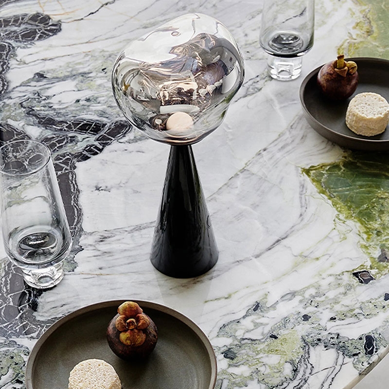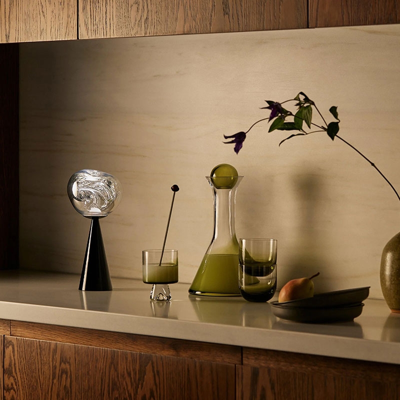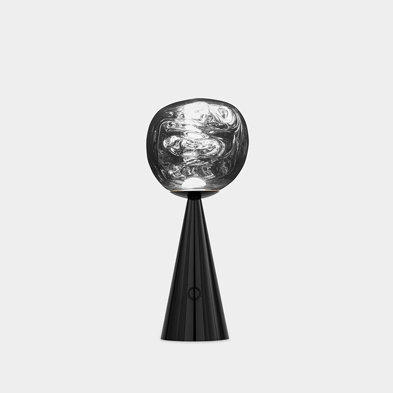 Melt Portable amplia la collezione di lampade Melt con un design portatile, offrendo lo stesso affascinante effetto vetro soffiato a caldo quando è accesa e un effetto specchiato quando è spenta. Realizzato in Germania con tecniche di produzione high-tech, evoca il vetro fuso o l'interno di un ghiacciaio in fusione.