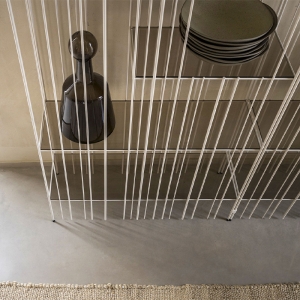 Metrica è una collezione di librerie da parete e da terra che comprende anche una consolle realizzate in metallo, con ripiani in vetro disponibili in due diverse colorazioni. Progettata da CtrlZak è realizzata con tondini d'acciaio con finitura titanio o brunita.