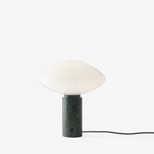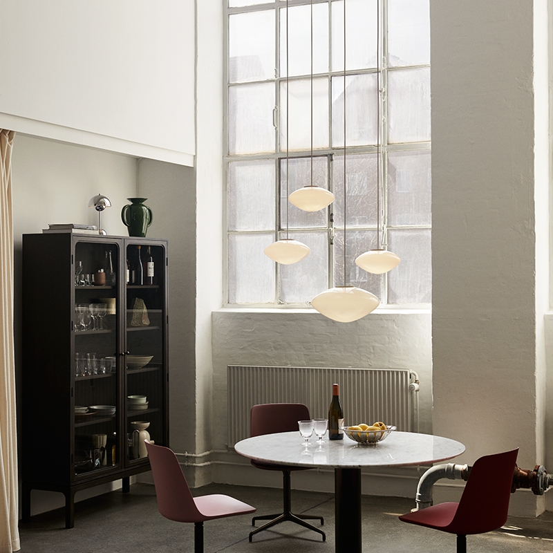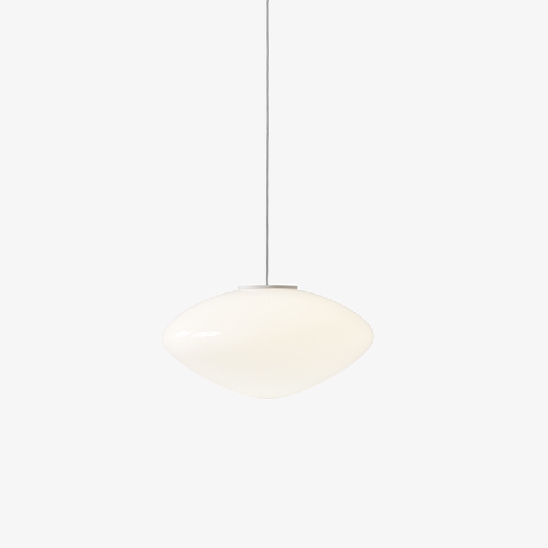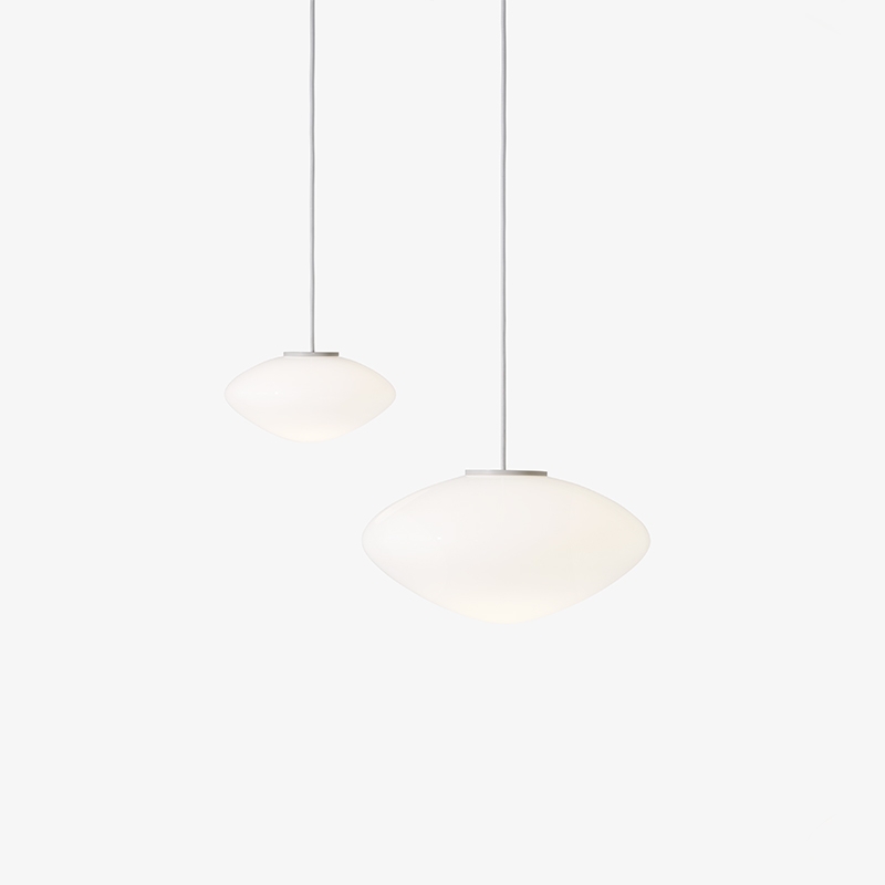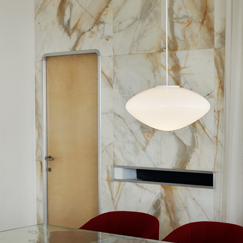 Mist, realizzata in vetro opalino soffiato con dettagli in alluminio verniciato bianco, si ispira alla luce calda e diffusa dei raggi di sole mattutini.