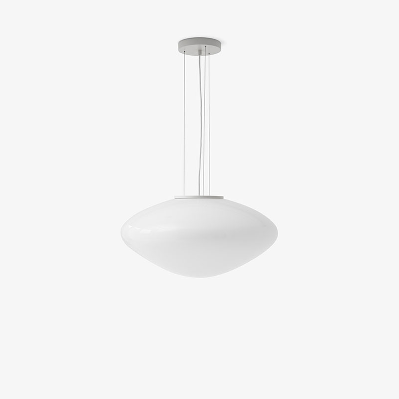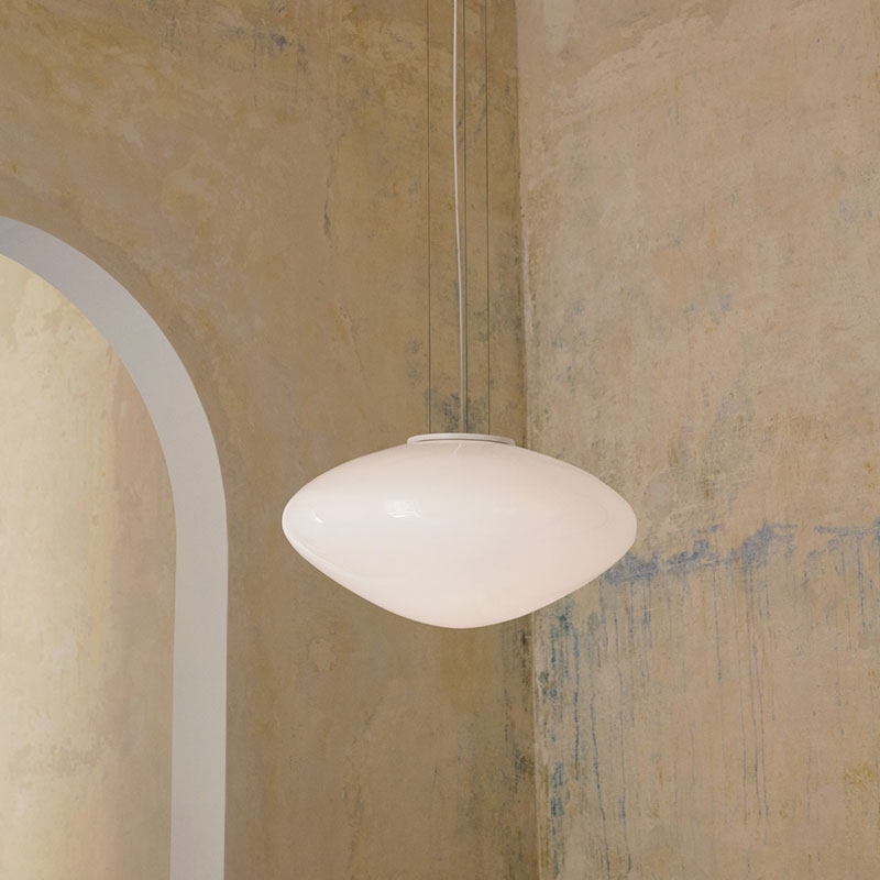 Mist, realizzata in vetro opalino soffiato con dettagli in alluminio verniciato bianco, si ispira alla luce calda e diffusa dei raggi di sole mattutini.