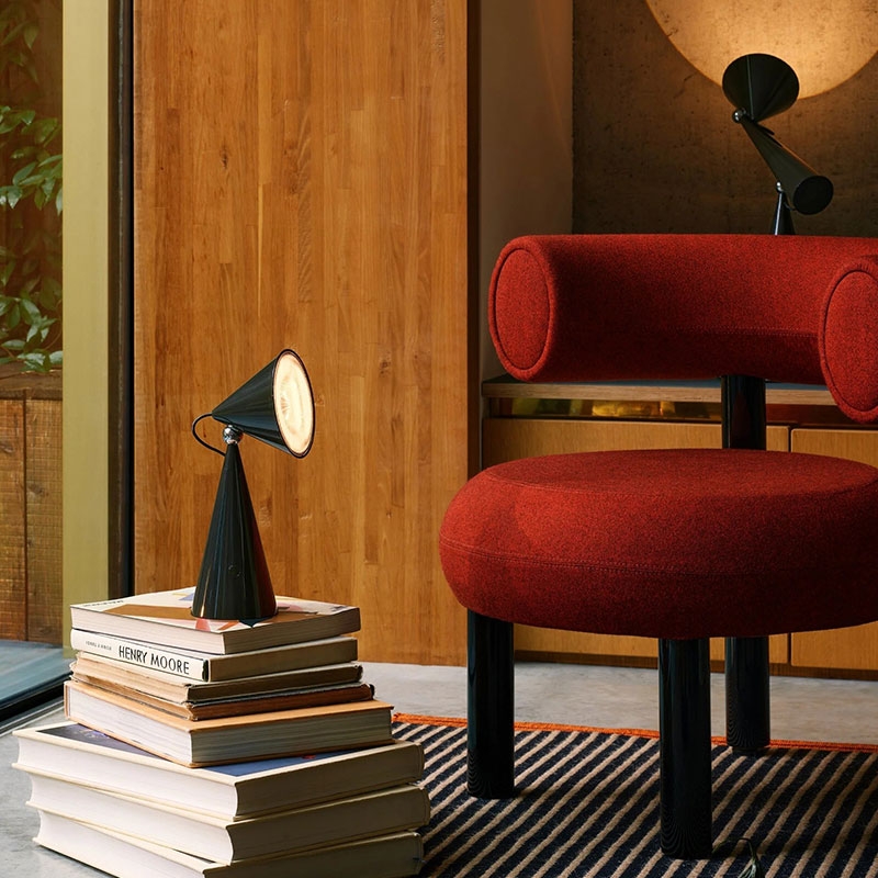 Con una silhouette decisa e un tocco di ironia, Pose Portable orienta la luce creando fasci luminosi di grande effetto. È dotata di un anello LED dimmerabile a 3 livelli che oscilla tra 2700K e 3000K, alimentato da una batteria ricaricabile con un'autonomia di 6-9 ore. La praticità funzionale incontra il design minimalista.
