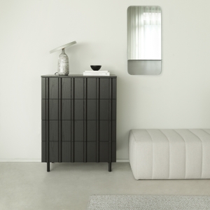 Disponibile nelle finiture Oak o Soft Black, ogni pezzo è realizzato utilizzando una miscela di alta qualità di impiallacciatura in rovere laccato e rovere massello, garantendo non solo durevolezza, ma anche un'estetica minimalista e naturale. In conclusione, la collezione Rib rappresenta un'aggiunta versatile e senza tempo a qualsiasi ambiente residenziale o commerciale.