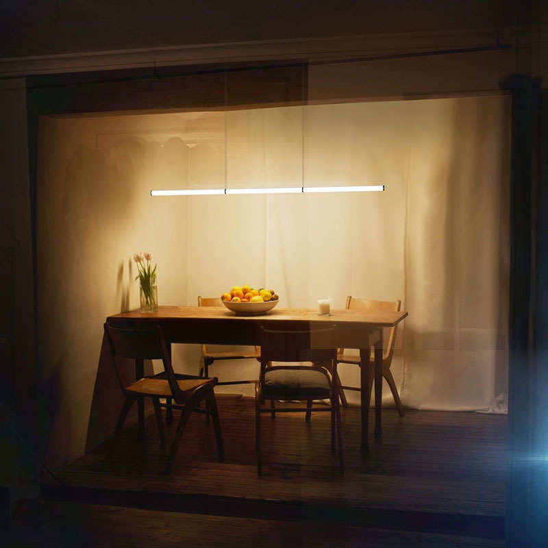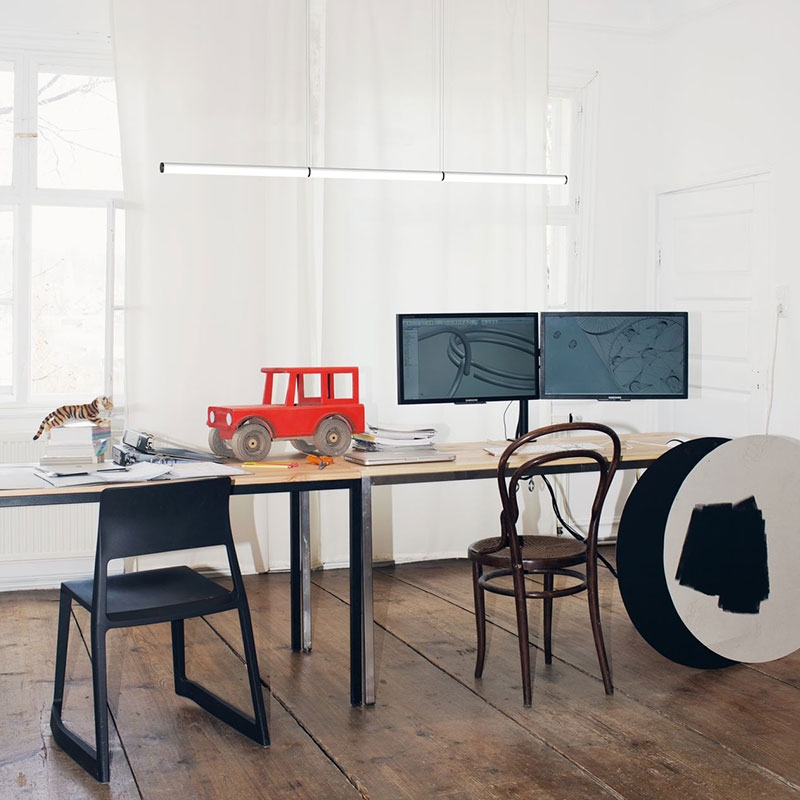 Satellit è una lampada a sospensione lineare ed elegante formata da un tubo in vetro poggiato su due sottili cavi d'acciaio che forniscono l’alimentazione elettrica. Il tubo può ruotare liberamente attorno al suo asse, permettendo di modificare l'atmosfera luminosa nella stanza in base alle proprie esigenze. Ruotata verso il basso può fornire luce diretta sul tavolo per lavorare, invece verso l'alto o lateralmente può creare atmosfere più intime grazie ad una luce indiretta.