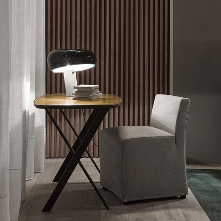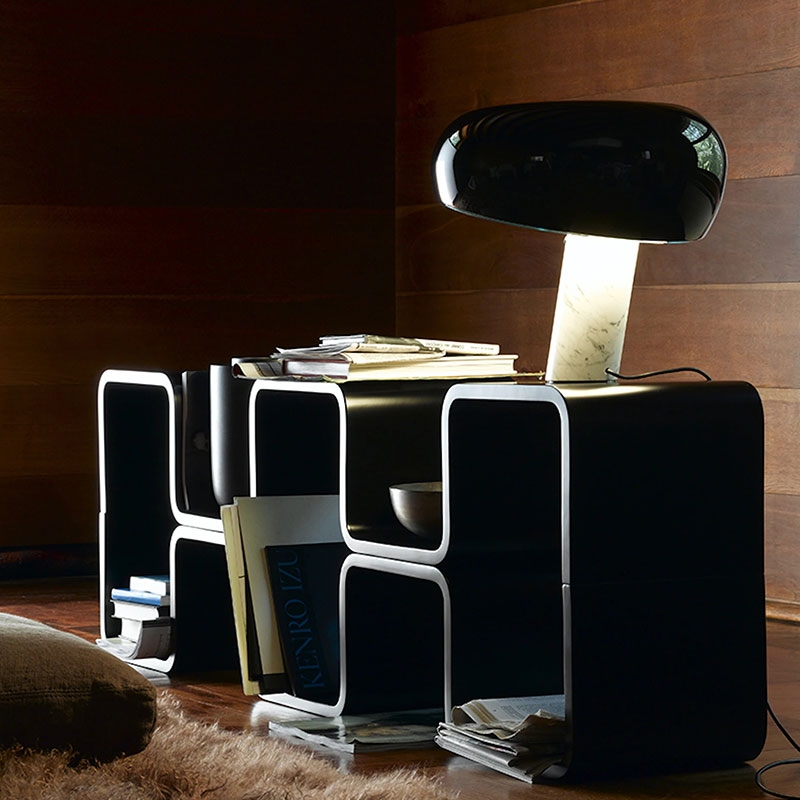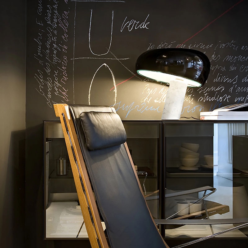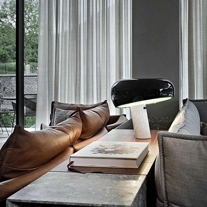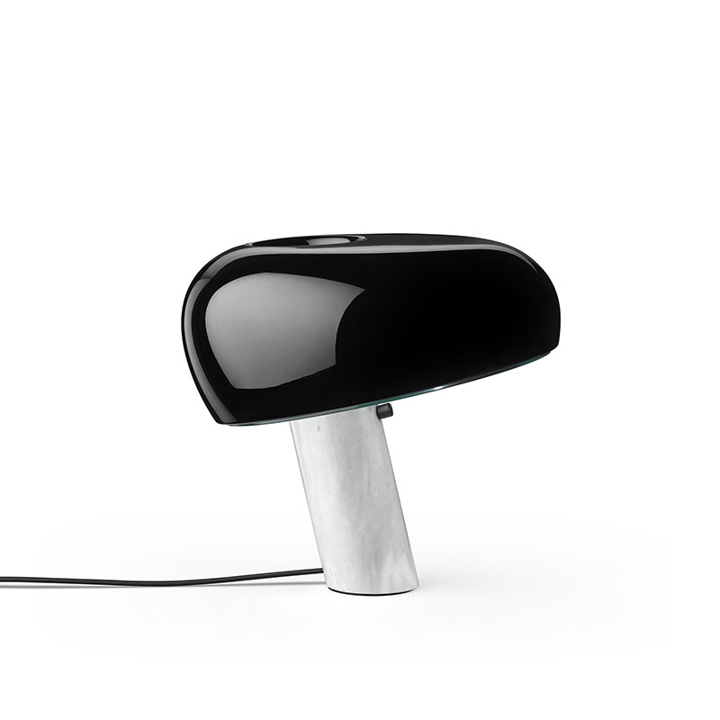 Lampada da tavolo a luce diretta con riflettore in metallo verniciato e base in marmo di Carrara bianco. Disegnata da Achille e Pier Giacomo Castiglioni nel 1967.