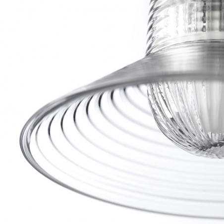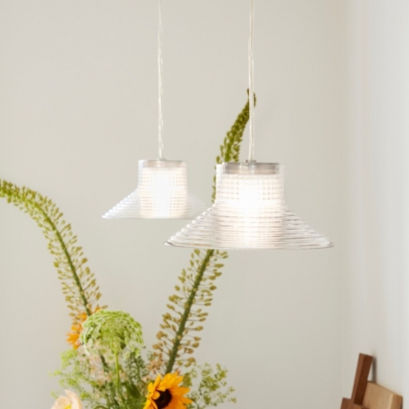 La lampada Sletterhage deve il suo nome all’iconico faro danese di Sletterhage, così come la sua forma, ispirata agli elementi inustriali del faro. Il paralume è realizzato in vetro trasparente rigato.